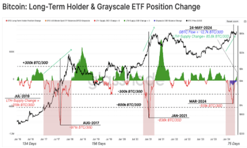通过运用市场价值与实现价值(MVRV)指标,Glassnode发现,长期持有者即将进入历史上未实现利润的高水平阶段。然而,与之前的牛市相比,即使在比特币价格达到73800美元的历史高点时,这些长期持有者也没有像过去那样大量抛售。