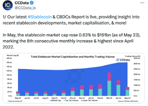CCData于5月29日发布的报告指出,稳定币的总市值相较本月初上涨了0.63%,达到1610亿美元。尽管市场占有率从3月份的7%微降至6.07%,但这并未影响稳定币整体的上升趋势。分析人士认为,市场占有率的轻微下滑主要是因为主要加密资产价格的回升,而这背后则是市场情绪在美国意外批准现货以太坊ETF后的进一步提振。