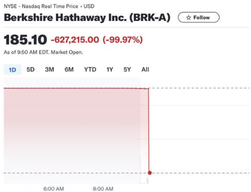 就在前几日6月3日,一场由纽约证券交易所(NYSE)技术故障引发的风波,让伯克希尔·哈撒韦公司(Berkshire Hathaway)的股票BRK.A经历了罕见的瞬间暴跌。故障导致股价一度下跌近100%,纽约证券交易所不得不暂停了几只重要股票的交易,以紧急修复问题。