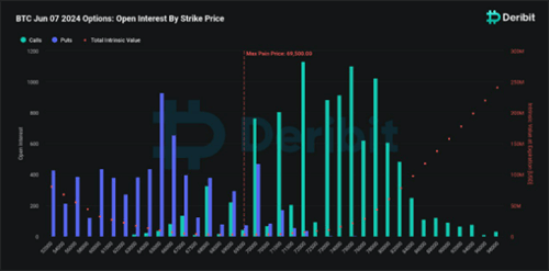 据悉,本周五将有总额高达12.2亿美元的比特币期货期权到期,其中,市场的“最大痛点”价格被设定为69,500美元。所谓“最大痛点”,即大多数期权持有者可能面临损失的价格点,但这并不意味着比特币价格一定会跌至该水平。